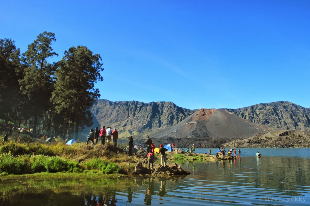 Saya bahagia karena pada logikanya untuk jalan ke danau adalah menurun, iya memang menurun, menurun dengan kemiringan yang ngga stabil. Sesekali harus merayap cantik dengan mengandalkan pegangan besi. Melewati beberapa anak tangga dan trek berkontur batu.
