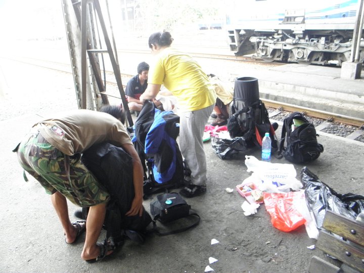 8 Jam perjalanan dari Jakarta, tepat jam 9 pagi kami sampai di stasiun Semarang, duduk-duduk santai di peron sambil bongkar trangia. :))