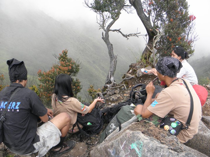 Semakin sore, senja mulai muncul dengan biasan oranye yang cukup menghangatkan tangan gue yang mulai kaku karna dingin dan masih harus merayap melewati tebing batu. Yang turun dan yang naik lewat secara bergantian, hingga akhirnya ada satu tangan yang menggapai tangan gue di langkah terakhir dan kami pun sampai di TOP 3142 M dpl. Puncak pertama gue yang akhirnya berhasil gue capai dengan sisa-sisa tenaga seorang pemula.